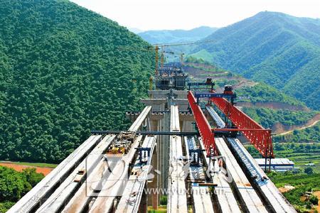 9月2日,新平县境内的戛洒江特大桥建设正酣。据悉,大戛高速公路是我市县域高速公路“能通全通”重点项目之一,该公路的戛洒江特大桥全长982.08米,桥面至江面高度206米,主跨200米,主墩高185米。目前已进入T梁架设和挂篮阶段施工,按计划将于今年底完工。