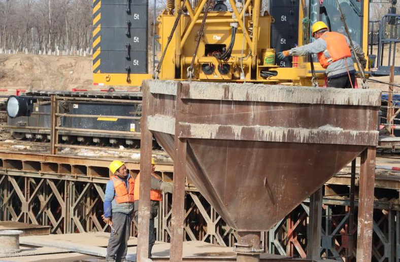 大桥主墩承台围护结构采用锁口钢管桩围堰,围堰长32米,宽28.1米,共计120根锁口钢管桩。“本次混凝土浇筑采用水下混凝土浇筑工艺,分两个作业面,利用钻孔桩护筒搭设工字钢平台,采用横向分层、纵向分段的方案进行浇筑。”中铁上海局京雄高速公路项目指挥长凡春胜介绍,在浇筑过程中,有专人不间断测量混凝土高度,来控制导管拔管的高度、浇筑顺序以及移动速度,确保了混凝土浇筑一次成型。